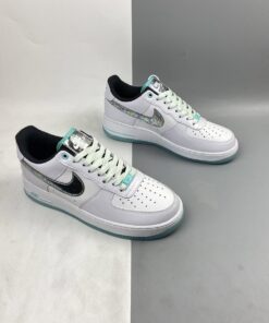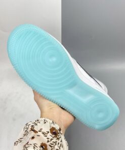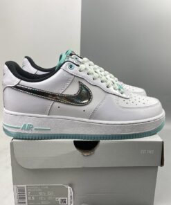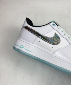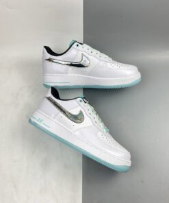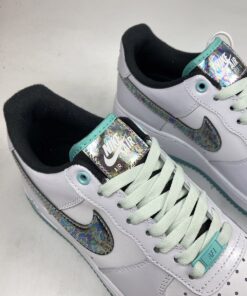 The abalone shell-like swoosh, which is an iridescent collage of blues, greens, and purples, sits atop a clean white leather base. The black used on the tongue and the inside sharply deviates from the stark white. Furthering the sea theme and adding extra pops of color, a bright aqua shade paints the outsole, piping on the tongue, and branding on the heel and midsole. This color gets softened to a mint-like shade for the laces, creating a balance of colors that allows for the shimmery swoosh to stand out.