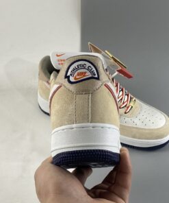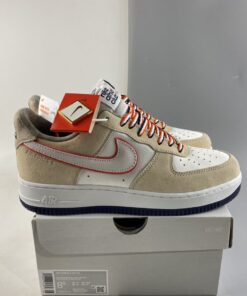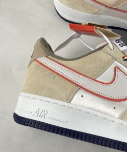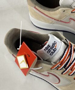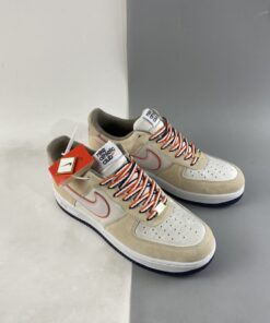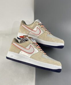 This offering of the Nike Air Force 1 Low features a Sail base with Khaki suede overlays highlighted with Orange contrasting accents atop a White midsole and Navy rubber outsole. A retro-inspired Nike Athletic Club tongue tags and insoles with a special sew-on patch on the heels completes the design.