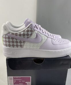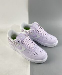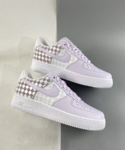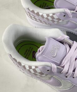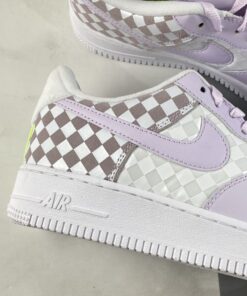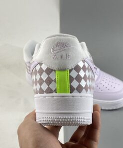 Moving backwards, a unique diamond/checkerboard pattern takes over the AF-1, in a tonal colourway, showing off a flash of neon green right down the heel line. Another flash of colour comes in on the centred eyelet, keeping the Checkerboard Air Force 1’s laces in place.