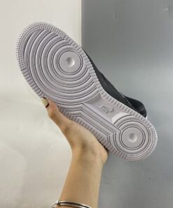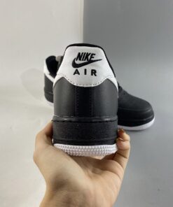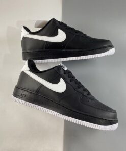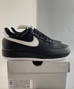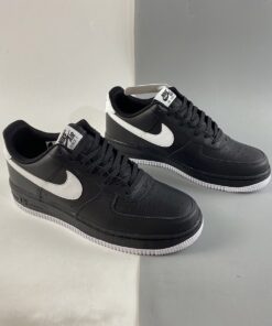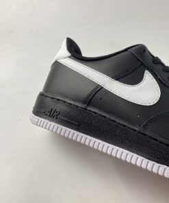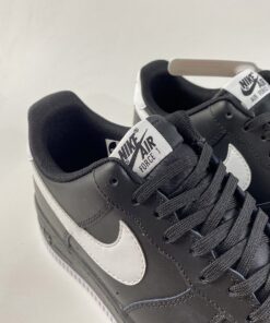 This offering of the Nike Air Force 1 Low features a Black leather upper with matching laces, mesh tongues, inner liner and midsole. White appears on the tongue label, Swoosh logos, heels, insole branding and rubber outsole to complete the design.