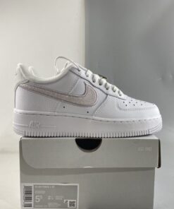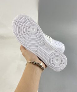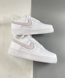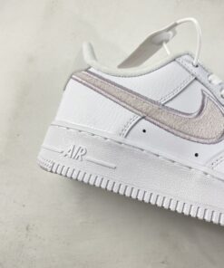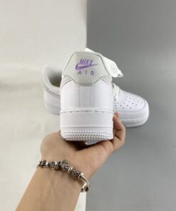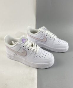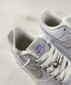 this Nike Air Force 1 Low features White leather across the base while the same shade lands on the laces, tongues, liner, midsole, and outsole. Sticking out the most, we have chenille Swooshes dipped in Violet while the same shade adorns the tongue and insole branding. Finally, a Silver Swoosh lace jewel finishes the look.