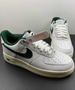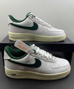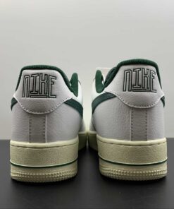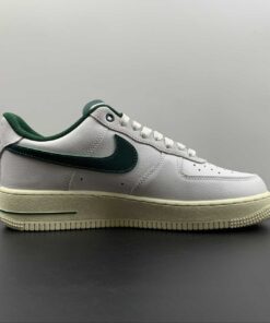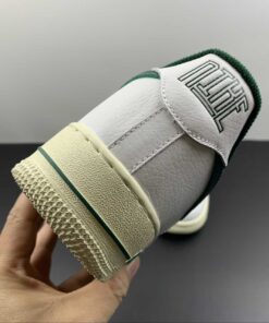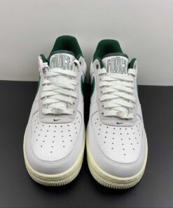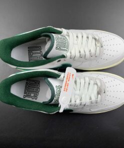 This low-top AF1 has a heavily tumbled Summit White leather upper. Sail-coloured suede eye stay panels provide light contrast. The signature profile Swooshes that glide across both the medial and lateral mid-panels are in dark Gorge Green. The terry sock liner and the tongue lining all follow suit. Gorge Green “Force” outline branding stands out on the Summit White tumbled leather tongues. A vintage-looking Sail-coloured sole unit wraps up the look of these kicks.