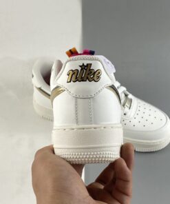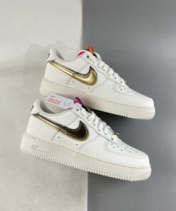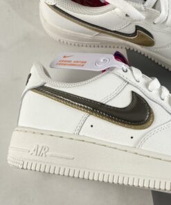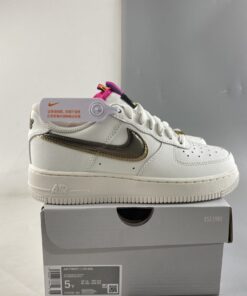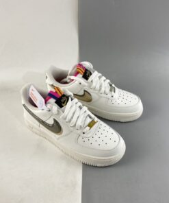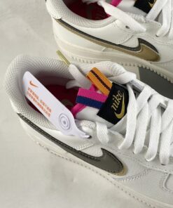 The iconic Nike Air Force 1 Low gets some new double layering detailing as we bring you a look at this new kids colorway. This Nike Air Force 1 Low starts off with a clean white smooth leather construction on the base of the shoe which is then joined by double Metallic Gold and Metallic Silver Swooshes on the side panels. Another unique feature is seen on the tongued where we see double colorful pull tabs on the tongues and cursive gold and black Nike branding on the heels. Pink insoles with white Nike branding and mismatch gold and silver Nike dubraes round out the main details of this grade school Nike Air Force 1 Low that will be releasing in the coming weeks.