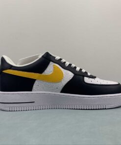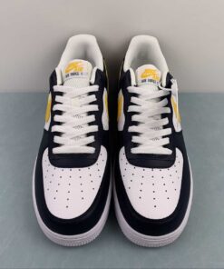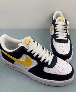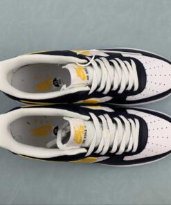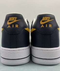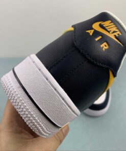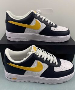This Nike Air Force 1 Low comes dressed in a Dark Obsidian, University Gold, and White color combination. Constructed with tumbled and smooth leather across the upper, and retro-inspired Basketball logos appear on the side panels. Obsidian adorns the overlays with Gold on the Swoosh logos, ‘AIR’ branding, tongue labels, and heels. Other details include a White midsole and matching rubber outsole.