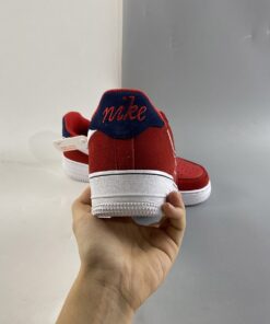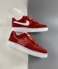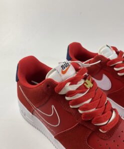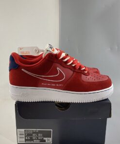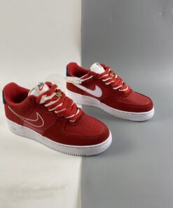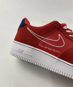 For instance, the lace unit makes use of not one but two strings, mixing together shades of white and deep red. Over top, gilded accessories help commemorate the new design in a way not like your ordinary dubrae. Suede overlays and leather bases furnish the rest of the upper, representing half of the aforementioned pairing. The tongue, logos, and midsole dress to its opposite, each — e.g. the thin, outlined Swoosh, “First use…” text, and vintage-inspired woven label — rather contrasted against the smooth and rough textures. Navy heel tabs and elegant embroidery, then, round off the colorway with some USA spirit.