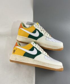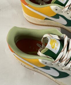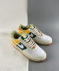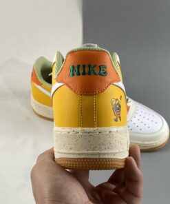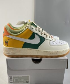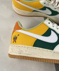 the newly-surfaced offering follows a new off-white, green, gold and orange color arrangement across its synthetic leather upper. At first glance, the Air Force 1 Low seems in-line with the brand’s famous “Roswell Rayguns” theme, but closer inspection at the embroidered figure at the lateral heel reveals an entirely different concept: an anthropomorphic basket carries several fruits that lend their hues to the latest take on Bruce Kilgore’s decades-old design. Underfoot, sole units also join in on the colorful fun, as midsoles opt for a speckled makeover and tread indulges in a fan-favorite semi-translucent light gum brown finish.