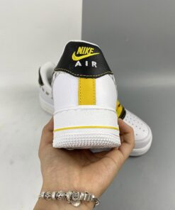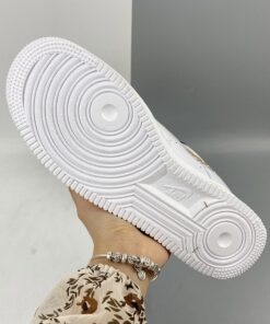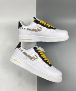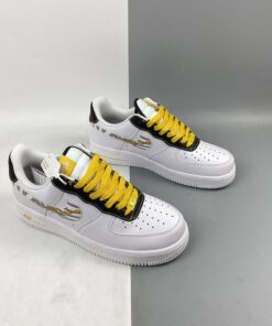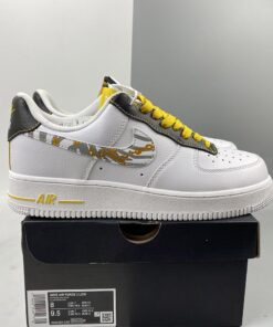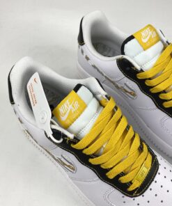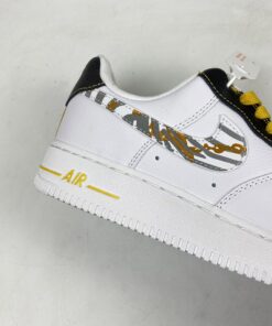 Our next pair to showcase of the low-top Nike Air Force 1 features a clean theme with flashy accents. First, they come with White leather across the upper and the traditional perforations on the toe box and panels. Next, we have Black textured nubuck on the eyestay overlay and heel. Sticking out the most, the Swoosh comes with Gold links and 3M reflective Zebra stripes, which gives this pair a unique look. Furthermore, Yellow appears on the laces, tongue label, Nike branding on the heel that also runs down it. Finally, a White midsole and a matching rubber outsole finish the look.