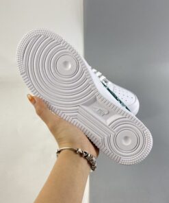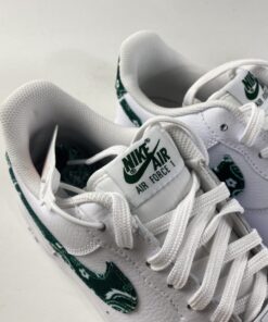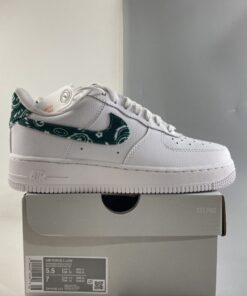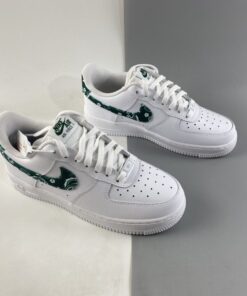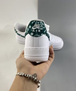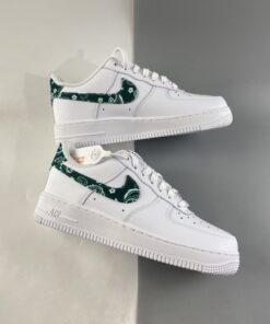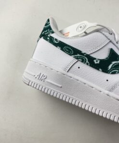 This offering of the Nike Air Force 1 Low features a clean White tumbled leather upper that matches its tongues, laces, embroidered branded heels and AF1 rubber sole. Highlighting the shoe are Green paisley prints on the Swooshes and heels along with additional branding on the tongues and insoles.