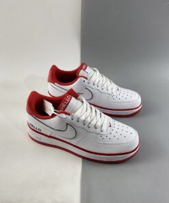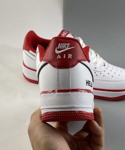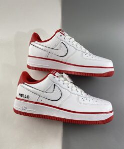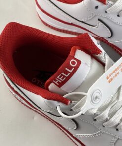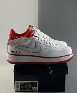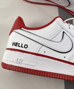 Going over this Nike Air Force 1, they feature a White, University Red, and Black color combination. Utilizing White leather across the upper while Black outlines the Swoosh on the panels and ‘Hello’ by the lateral heel. On the tongue label, we have the ‘Hello’ name tag while the word and Nike Air adorns the insoles. Finally, a White midsole and a Red rubber outsole finish the look.