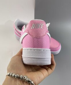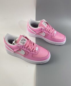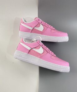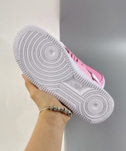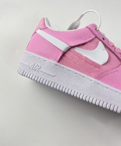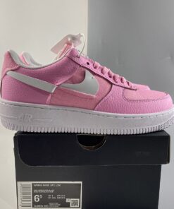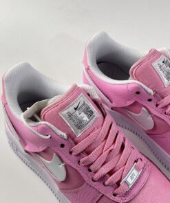 Dressed in a Pink Foam, Foam and Black color scheme. This Nike Air Force 1 Low features textile Pink appearing on the toe box, side panel, tongues, and heels with a lighter shade of Pink leather used on the overlays and eyestays. White Swooshes and rubber AF1 sole with the models signature tag label displayed on the tongues completes the design.