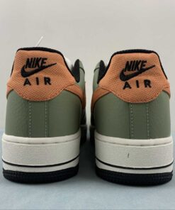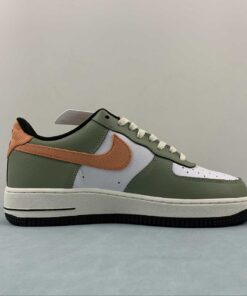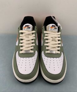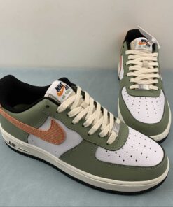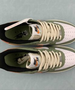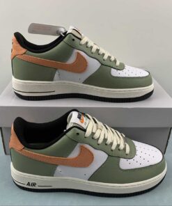 Boasting a signature smooth white leather base, this colorway then opts for contrasting “Oil Green” for its tumbled leather overlays and “Safety Orange” for the profile Swooshes. Additional hits of “Sail” arrive on the midsole, along with black on the liner and outsole. Further elevating this AF1 Low offering are the hemp-like canvas tongues and heels. The hemp-like textile is also featured on the Swooshes.