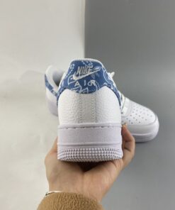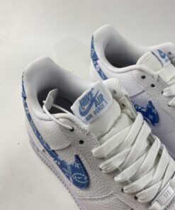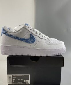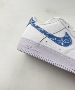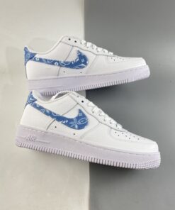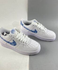 This offering of the Nike Air Force 1 Low features a clean White tumbled leather upper that matches its tongues, laces, embroidered branded heels and AF1 rubber sole. Highlighting the shoe are Worn Blue paisley prints on the Swooshes and heels along with additional branding on the tongues and insoles.