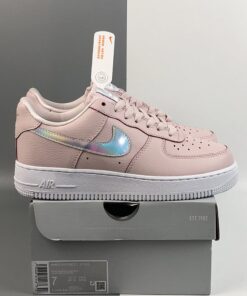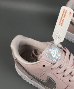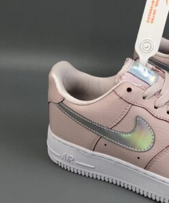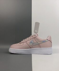 This Nike Air Force 1 comes with Pink tumbled leather across the upper while White covers the midsole and rubber outsole. Sticking out the most is iridescent on the tongue label and Swoosh across the panels.