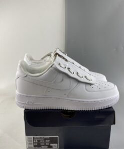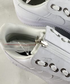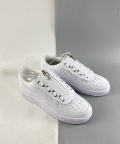 The Nike Air Force 1 Low “Shroud” features a shroud over the laces which replace the typical lacing system with metallic silver accents on the eyelets and the zipper with a Swoosh. The rest of the upper is seen in all-white leather with a mesh tongue. Nike branding is stitched on the medial side of the shroud as well as on the heel. Lastly, a white midsole and outsole finish off the sneaker.