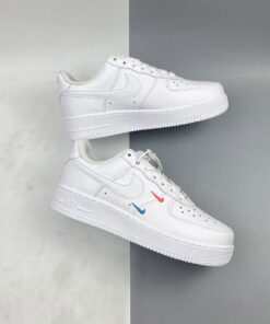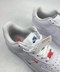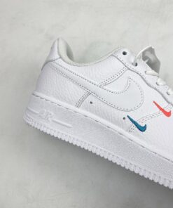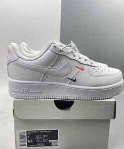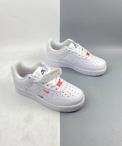 This offering of the Nike Air Force 1 Low features a Summit White tumbled leather upper with smooth leather Swooshes and mesh tongues. Mini Swooshes on the lateral forefoot in Orange and Teal atop a solid White AF1 sole completes the design.