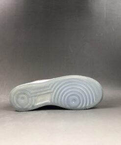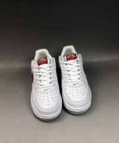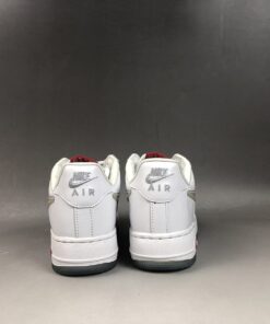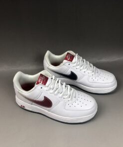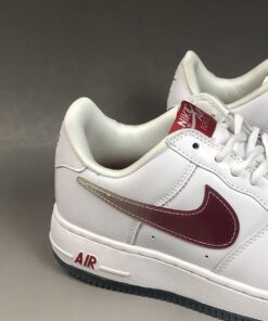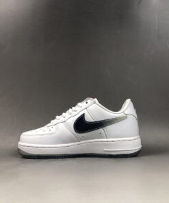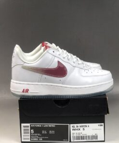 The classic shoe features a full White patent leather upper with bold mismatched Nike Swoosh logos in a Red gradient and Navy gradient color tones.
