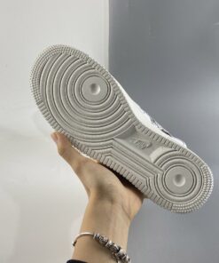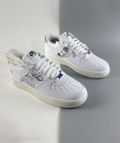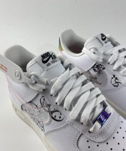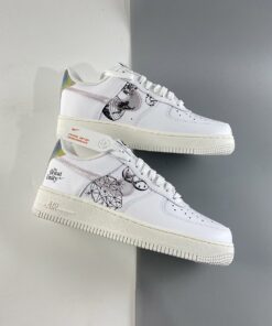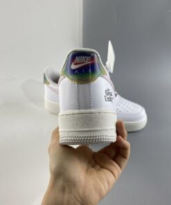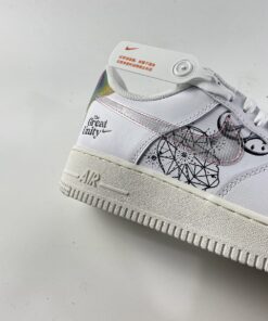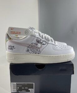 This offering of the Nike Air Force 1 sports a classic all-White color palette detailed with special graphics on the lateral and medial side panels. Transparent Swooshes on the sides, holographic “NIKE AIR” branded heels, “The Great Unity” stamped on the lateral heel, iridescent lace dubraes with Pink branded insoles completes the design.