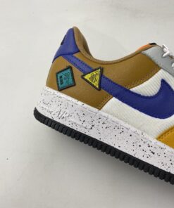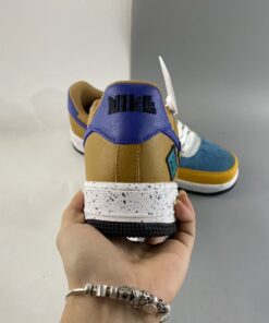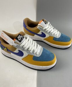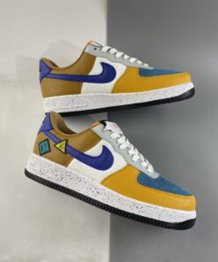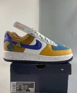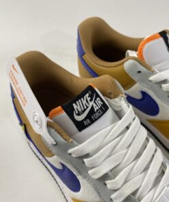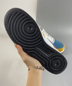 This offering of the Nike Air Force 1 Low arrives in a University Gold, Light Bone, Starfish Orange, and Blue Stone color blocking. It comes constructed in a mix of leather, suede, mesh, and corduroy-like materials with patches on the lateral atop a speckled midsole.
