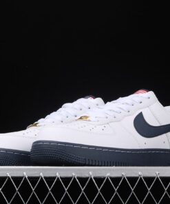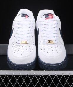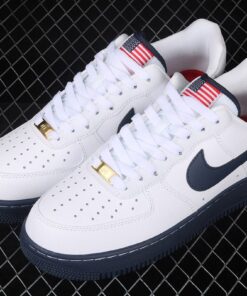 Dressed in a White, Sport Red, Metallic Gold, and Obsidian color scheme. This Nike Air Force 1 Low features a White tumbled leather upper paired with Obsidian Swoosh logos and rubber soles, along with Red contrasting accents throughout. An USA flag covers the tongue labels to complete the design.