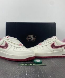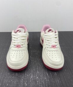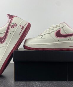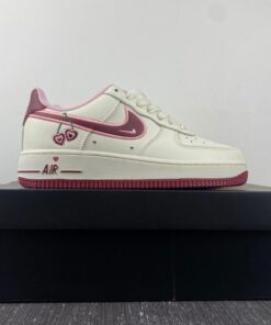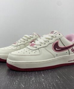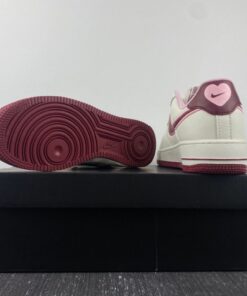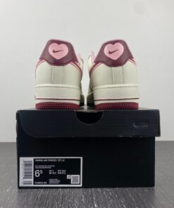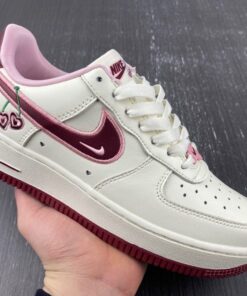 Taking on sail hues across its tumbled leather upper, various hits of burgundy red and pink accent alongside additional heart-shaped details throughout. Standard AF1 details like the perforated toebox and lace dubrae remain, however, the latter of the two takes on a pink heart-shape design while the tongue tag atop the sail tongue comes with a two cherry heart design. This same graphic also makes its way over to the Swoosh along the midfoot which comes trimmed in pink and features a secondary mini Swoosh in white near the front of the logo. More pink shades are present on the sockliner while the heel tab’s red makeover is broken up by a pink heart debossed into the center. Rounding out the design is the sail rubber midsole with a heart dotting the “I” in “AIR” near the heel while the outsole below comes in burgundy red.