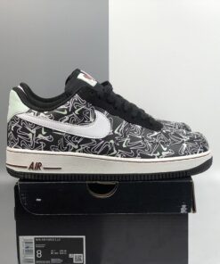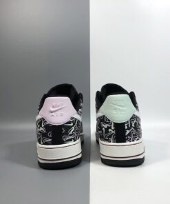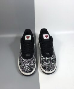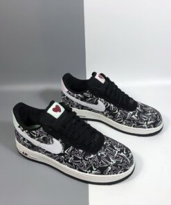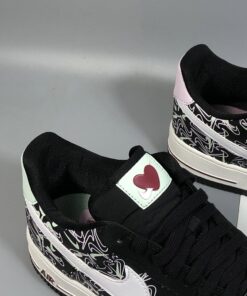 This offering of the Nike Air Force 1 Low features a Black leather upper covered in mini Swoosh logos with White leather Swooshes on the sides. Heart logos on the tongues, Mint and Pink heels and insoles that read, “U Complete Me” completes the design.