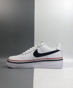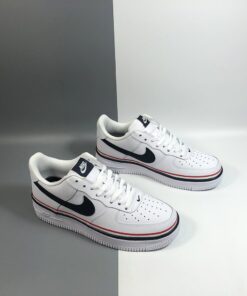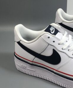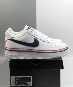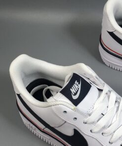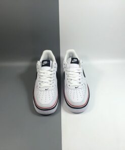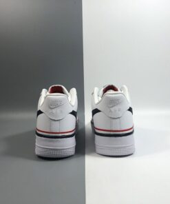 This latest offering of the Nike Air Force 1 Low sports a clean White smooth leather upper paired with Navy tumbled leather Swoosh logos on the sides. Red, White, and Navy ribbons wraps around the shoe, while sitting atop a solid White rubber sole.