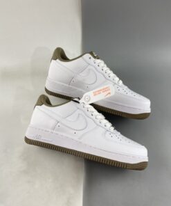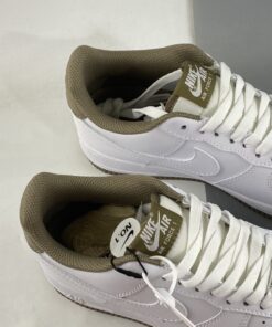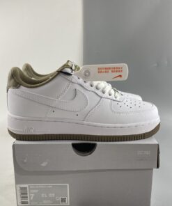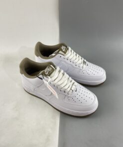 Like many a pair before it, This Nike Air Force 1 comes in a clean theme with White leather on the base.. Swooshes, overlays, and unders all feature said material, matching the identically-shaded laces and midsole. Dubraes, though, opt for a silver metallic finish, and the adjacent detailing — such as the heel tab, lining, tongue label, and outsole — indulge in a light olive coloring.