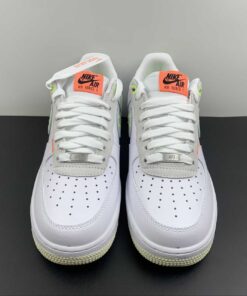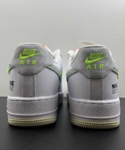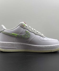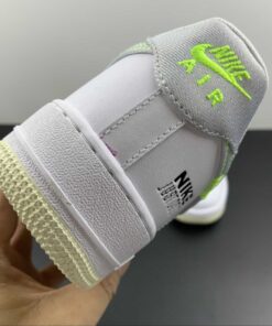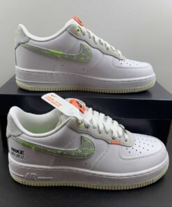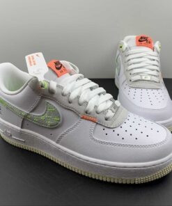 This offering of the Nike Air Force 1 Low comes constructed in a mix of leather, suede, and mesh materials featuring a White leather base with Grey Swooshes and heels. “Just Do It” stamped on the lateral heel highlighted with Neon contrasting accents and exposed stitching. A two-tone AF1 rubber sole completes the design.