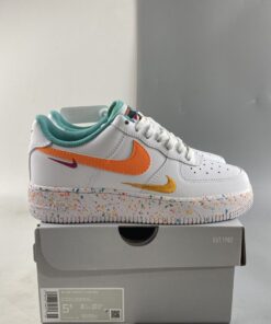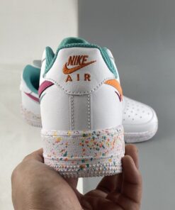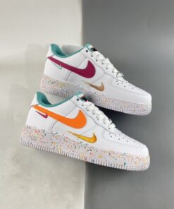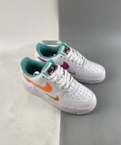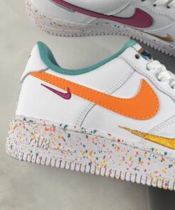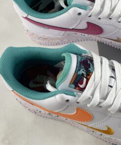 AF1 but make it extra fun! The Nike Air Force 1 Low GS White Teal begins with a crisp smooth white leather upper which includes the perforated toe, quarters and overlays. It is then decorated with playful additions such as the triple Swoosh design which sees the side panels featuring a leather Swoosh — orange for the lateral side, and pink for the medial side — with tangerine and berry red embroidered Checks on its side. The shoe is further brightened up by the teal lining along the tongue and the inner portion. Underfoot, the chunky Air Force 1 Low GS sole unit is sprinkled with multicoloured paint-like specks.