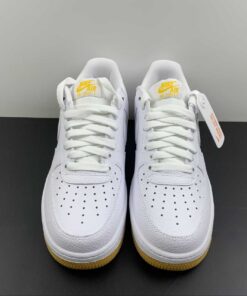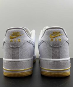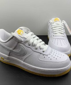 This offering of the Nike Air Force 1 Low features a clean White tumbled leather upper with smooth leather Swooshes. White mesh tongues, laces, and midsole highlighted with Yellow contrasting accents atop a Gum outsole completes the design.