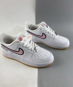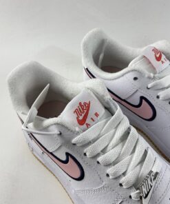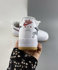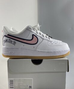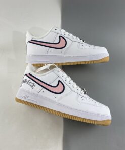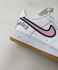 Similar to the lettering found on a letterman’s jacket, the pink profile Swooshes are animated by navy embroidered outlines. Varsity themes continue with “Just Do It” printed on the lateral side of the heel in a cursive font that mimics the look of embroidery. Even the red Nike logos on the tongue and heel tab are stylized similarly to maintain the letterman’s jacket aesthetic. A white “NIKE” enamel lace dubrae and light brown outsole complete the style for a BTS-ready arrangement.