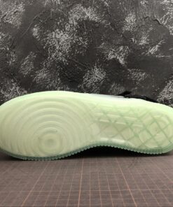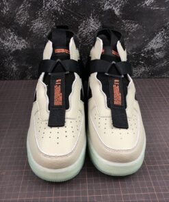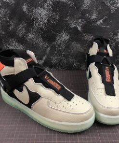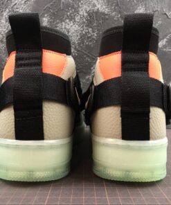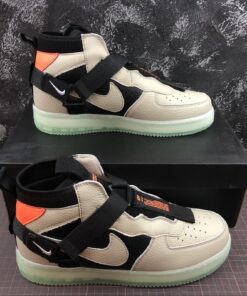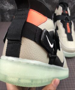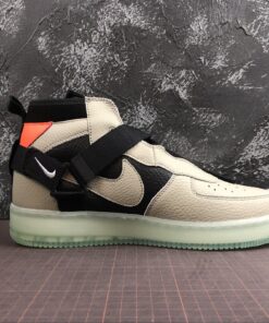 Dressed in a Spruce Fog, Black, and Frosted Spruce color scheme. This Utility edition of the Nike Air Force 1 Mid features a Grey and Black tumbled leather upper with Orange accents atop a Green semi-translucent sole unit.