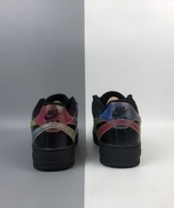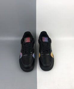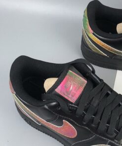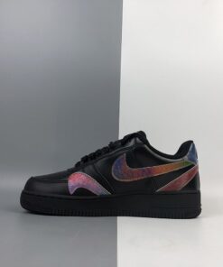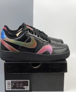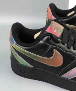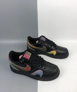 At its core, the leather uppers and soles translate that of a normal triple black AF1 Low, but the spirit is uplifted by way of its surrounding Swooshes. Accompanying the traditional lateral/medial checks arrives two more sets of the Carolyn Davidson-designed logo which have been flipped upside down and fastened to the forefoot, as well as on along the heels which connect and overlap in a way that slightly hides the rear Air branding. Each of these Swooshes, along with the square tongue stamps are treated with an multi-colored/iridescent shimmer that gradient between red, green, and blue tones.