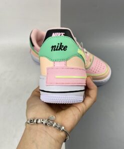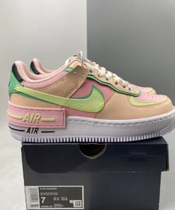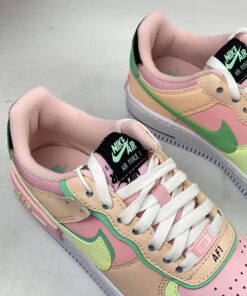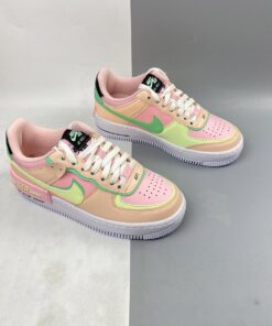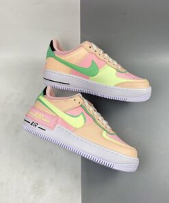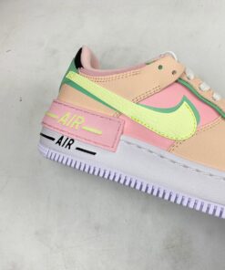 Dressed in an Arctic Punch, Barely Volt, and Crimson Tint color scheme. This Nike Air Force 1 Shadow features a Pink leather upper highlighted with pastel Yellow and Green contrasting accents. A solid White rubber sole completes the design.