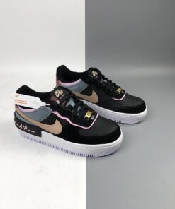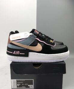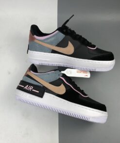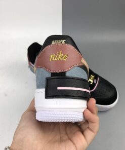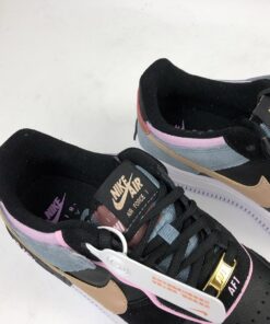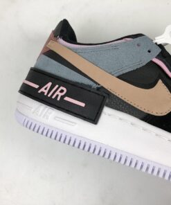 A colourblocked, multitextured upper is crafted from a leather base with suede and metallic overlays. Black laces down the throat contrast with the dusty-blue tongue and golden lacelock leading down to the delicate AF1 logo embroidered at the toe box. Baby pink velvet piping surrounds the eyelet area and the Swoosh arrives in a beige hue to tone down the darker colour palette. The retro Nike logo is embroidered in gold atop the metallic red heel. The platform midsole is enhanced with a misplaced Air logo in black and pink, creating that famous abstract aesthetic of the AF1 Shadow.