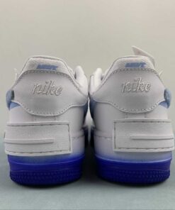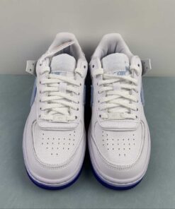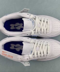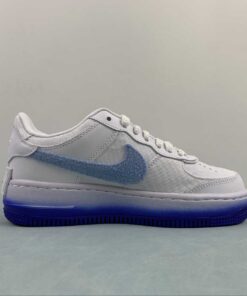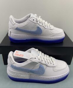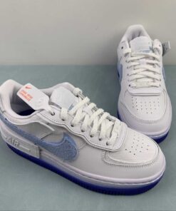This offering of the Nike Air Force 1 Shadow features an all-White upper constructed in a mix of canvas and leather materials detailed with Blue pastel chenille Swooshes on the sides. White fluffy laces with airbrushed White/Blue insoles and midsoles completes the design.
