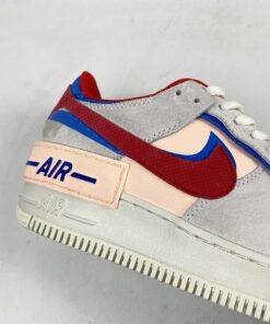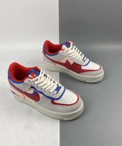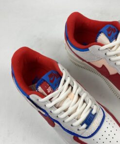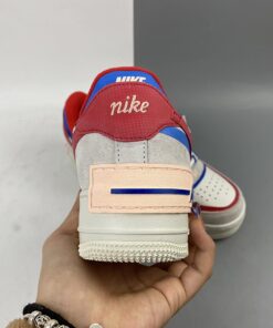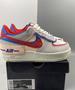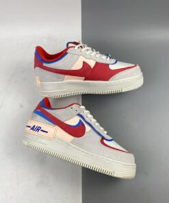 Dressed in a Sail, University Red and Photo Blue color scheme. This Nike Air Force 1 Shadow comes constructed in a mix of leather, mesh and suede highlighted with Red and Blue contrasting accents throughout. Hints of Pink atop a solid White rubber sole completes the design.