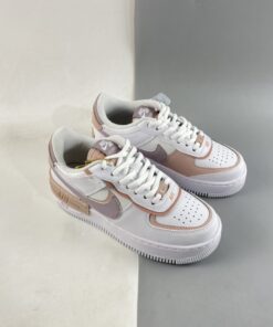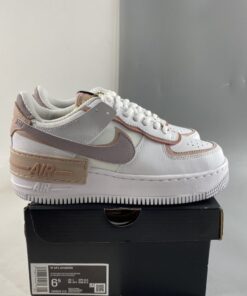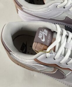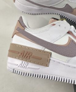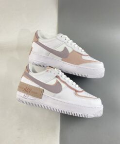 The white smooth leather upper is intercepted by off-white tumbled leather overlays. In true Shadow fashion, the lacestays, toe, and heel exhibit a layered look that uses “Pink Oxford”-tinted elements. This soft hue is also applied to the Swoosh printed on the lateral side, which is overlapped by a purple, “Amethyst Ash” piece. An AIR-branded rubber overlay is added to the heel to round out this pink and purple-accented design.