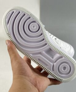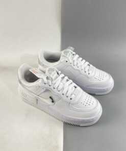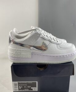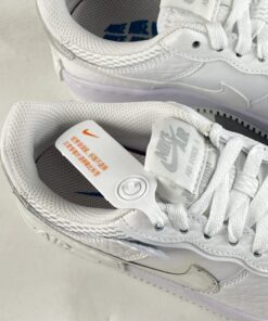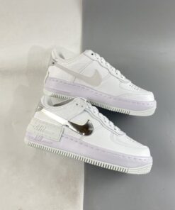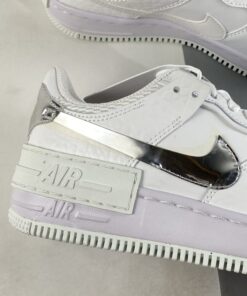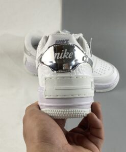 This offering of the Nike Air Force 1 Shadow features a White base constructed in a mix of smooth and tumbled leather materials detailed with Chrome overlays on the Swooshes and heels. Light Blue text appears on the insoles while the shoe is completed with a White doubled-layered rubber sole.
