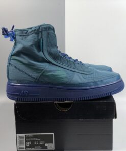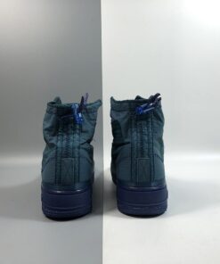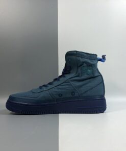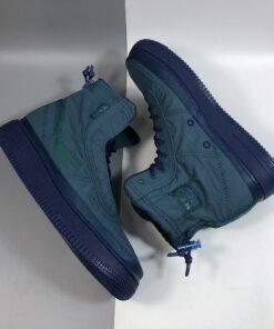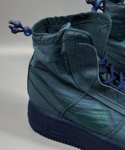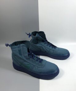 The Midnight Turquoise textile upper extends up your ankle, and is coated with a water-repellent finish to keep your foot protected from the elements. Taking design cues from traditional mountaineering jackets, you can toggle cinch loop closures on the upper and heel tab to keep water from seeping into the sneaker’s sherpa sockliner. Exposed stitching, militaristic AF1 branding, and a sprayed swoosh complete the utilitarian, storm-stomping design.