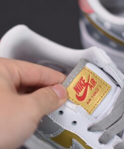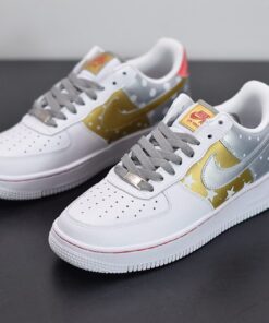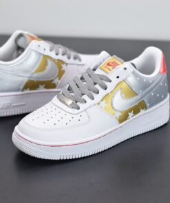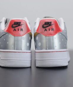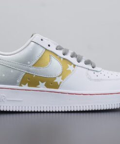 This offering of the Nike Air Force 1 Low features a White leather upper with Tan side panels covered in White stars, and Metallic Silver on the rear in White dots. A Silver Swoosh logo on the sides, matching-colored laces, Tan leather tongue labels, with a Red transparent heel tab completes the design.