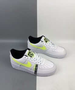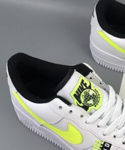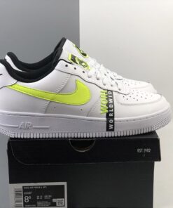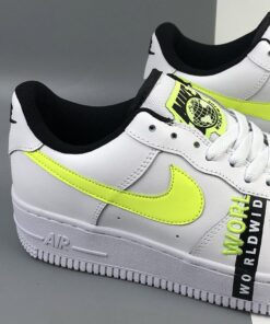 This Nike Air Force 1 Low comes dressed in a White, Barely Volt, Volt and Black color combination. Constructed with White leather across the upper while Black is applied to the liner Nike embroidered on the heel. In addition we have Volt on the Swoosh logo, ‘Nike World’ on the lateral heel while the ‘Worldwide’ logo is placed on the tongues which completes the look.