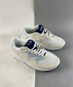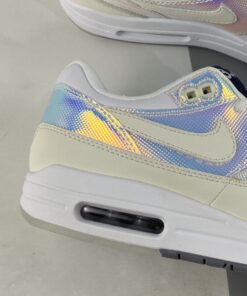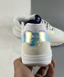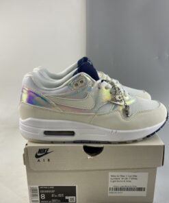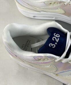 Dressed in a White, Neutral Grey, Metallic Silver, and Black color scheme. This offering of the Nike Air Max 1 features a White mesh base with iridescent overlays and Grey nubuck on the Swooshes and mudguards. It also celebrates Paris, the city of light, with “La Ville Lumière” text, “Spring 2022” and March 26th – the date the Air Max 1 debuted in ’87 – stamped onto the insoles, translucent outsole, box and its tissue paper. Navy tongues with “3.26” date along with a set of small Air Max charms completes the design.