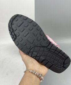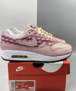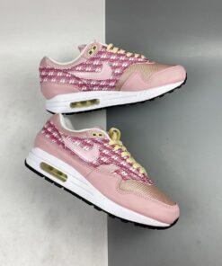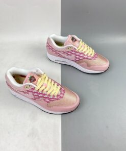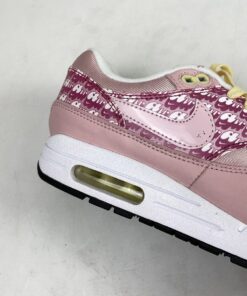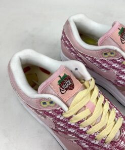 Dressed in an Atmosphere and True White color scheme. This Nike Air Max 1 features a predominately Pink base covered in “Air” branding printed throughout the side panels. 3M reflective detailing, strawberry logos on the tongues and insoles along with lemons completes the design.