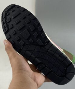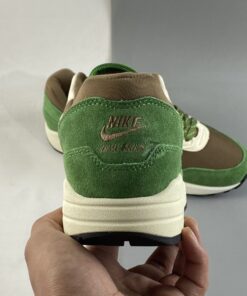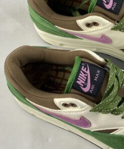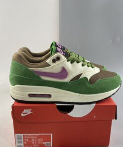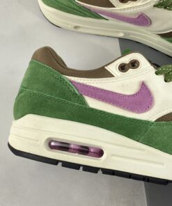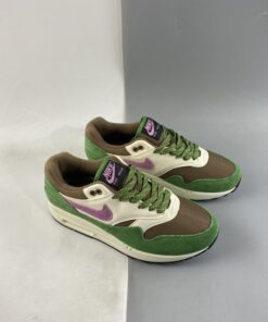 Dressed in a Treeline, Light Bordeaux, and Dark Driftwood color scheme. This offering of the Nike Air Max 1 comes constructed in a mix of leather and mesh with Purple and Green hairy suede overlays on the Swooshes, mudguards and heels, respectively. A White midsole atop a Navy rubber outsole completes the design.