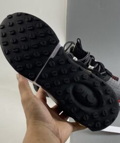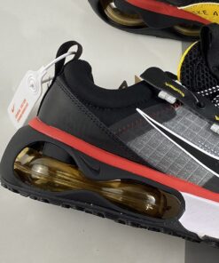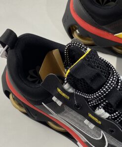 that sees black overlays of varying opacities and shapes for an avant-garde look. The body’s greyscale scheme is interrupted by the gold branded overlay emblazoned on the medial side, which makes up for the lack of a Swoosh logo. Hits of gold are also applied to the piping details on the tongue and decorative stitches on the lacestays, furthering the Rayguns theme. Another team color, red, can be seen tinting the midsole stripe and a small band of stitches that run down the toe. To complete the space-age style, the midsole is split between black and white and features a dual-pressure Air unit at the heel in the aforementioned gold tone.