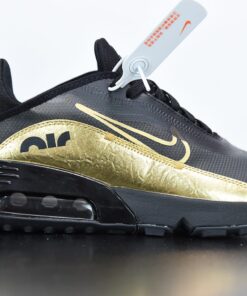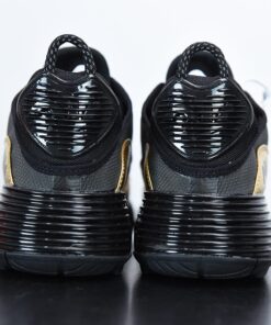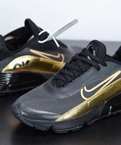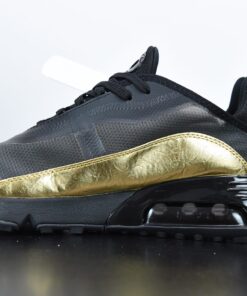 This offering of the Air Max 2090 features a Black base with Gold foil mudguards, along with added Gold branding on the outline Swoosh, tongues, and insoles. A Gold Swoosh lace dubrae atop a Black rubber sole completes the design.