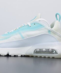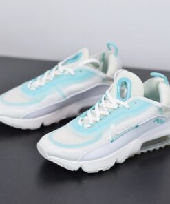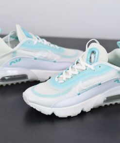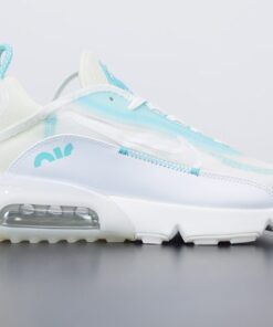 Dressed in a Sail, Black, Aurora Green, and Summit White color scheme. This offering of the Nike Air Max 2090 features a Sail transparent upper with a matching textile leather mudguard, and mesh tongues. Highlighting the shoe are Aurora Green contrasting accents throughout atop a White rubber sole atop a milky-translucent underfoot in the rear.