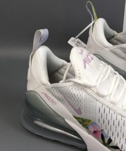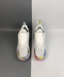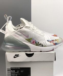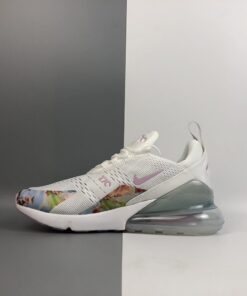 This Nike Air Max 270 features a White mesh upper highlighted with floral patterns throughout in shades of Pinks, Blues, Oranges, and Yellow. The same print is found on the insoles atop a Pink rubber outsole.