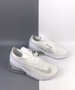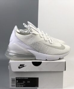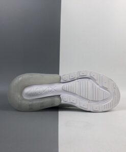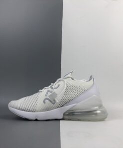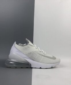 This Nike Air Max 270 features an all-White Flyknit upper that comes constructed with a sock-like collar and leather heels. Adding a bit of contrast are Light Grey tones on the Swoosh logo and “AIR” branding.